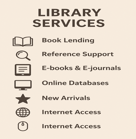 The library offers a wide range of services to enhance learning and research. From book lending, renewals, and reference support to access to e-books, e-journals, and online databases, users can explore both print and digital resources with ease. Facilities such as OPAC for quick searches, internet-enabled computers, new arrivals displays, and bound volume collections ensure a rich academic experience. To support comfort and safety, property counters and fire safety arrangements are also available.